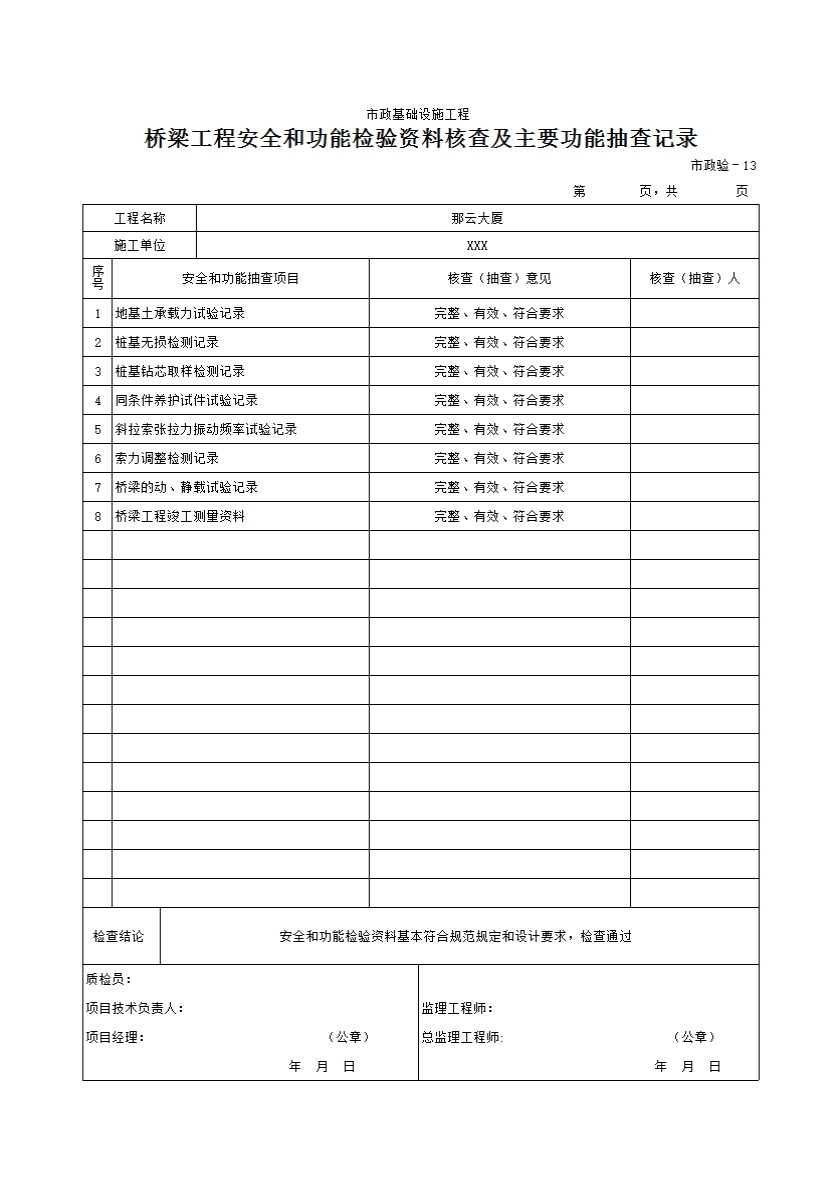 表格名称:市政验—13桥梁工程安全和功能检验资料核查及主要功能抽查记录