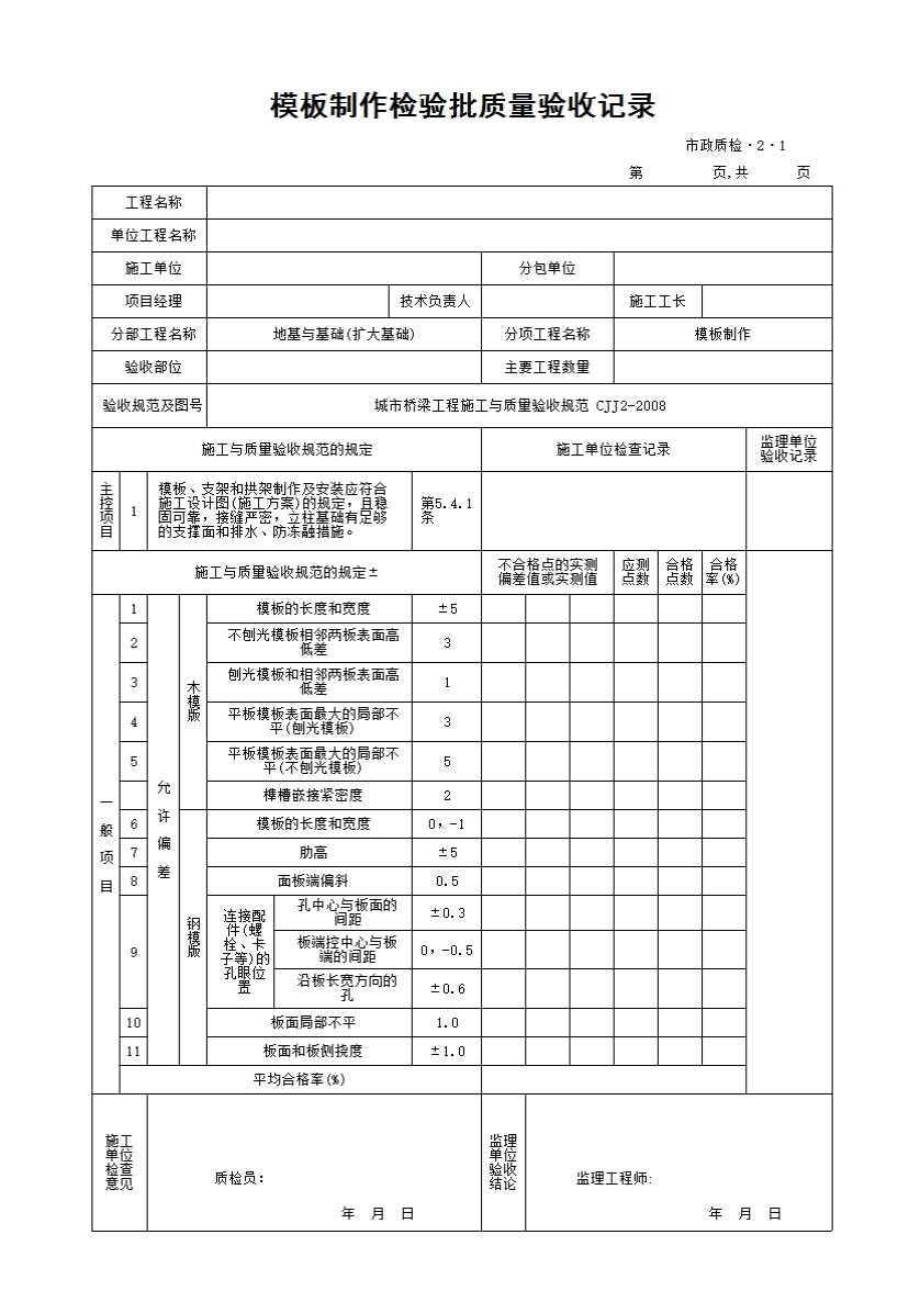 模板制作检验批质量验收记录