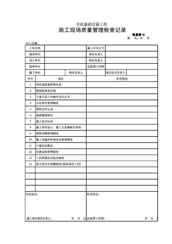 表格名称:轨道管-5 施工现场质量管理检查记录