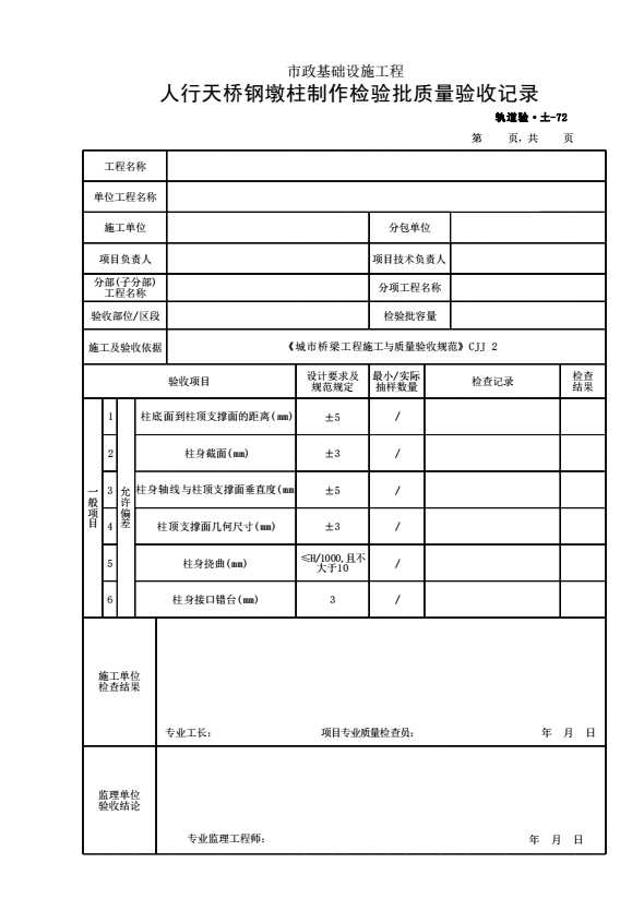 表格名称:轨道验土-72 人行天桥钢墩柱制作检验批质量验收记录