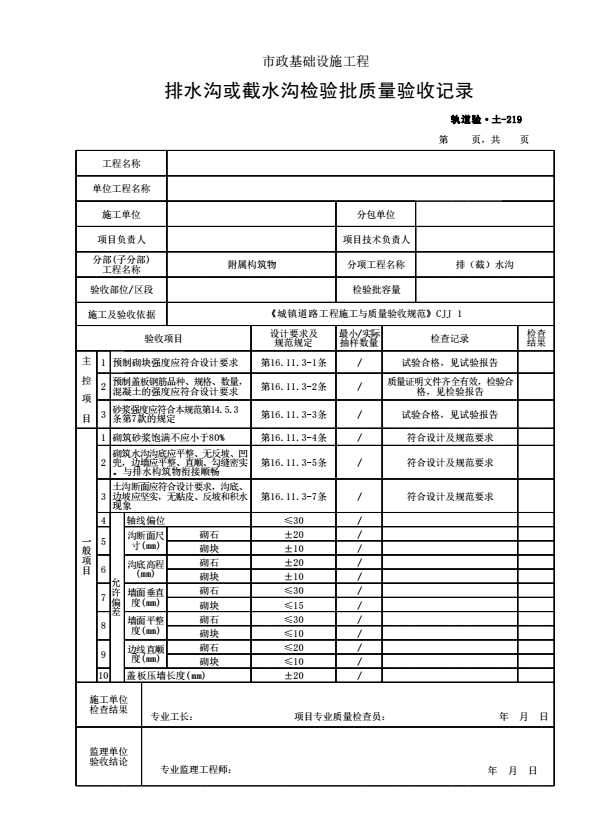 表格名称:轨道验土-219 排水沟或截水沟检验批质量验收记录