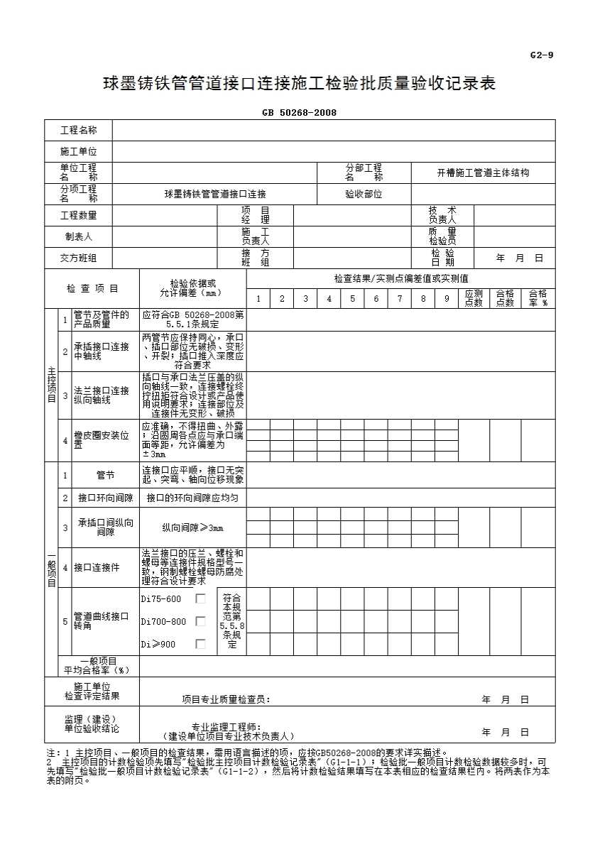 球墨铸铁管管道接口连接施工检验批质量验收记录表