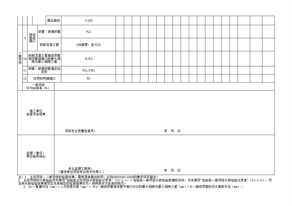 顶管管道施工检验批质量验收记录表