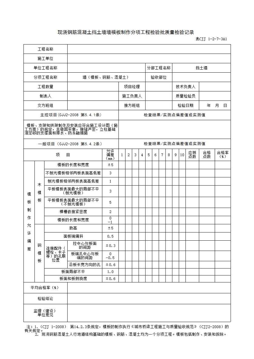 表格名称:表CJJ 1-2-7-3A1 现浇钢筋混凝土挡土墙墙模板制作分项工程检验批质量检验记录