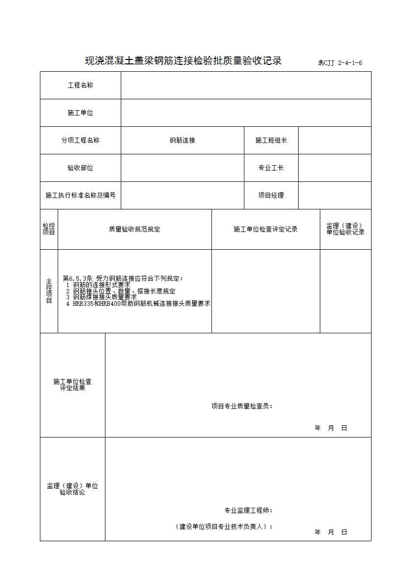 表格名称:表CJJ 2-4-1-6 现浇混凝土盖梁钢筋连接检验批质量验收记录