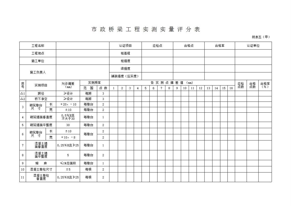 表格名称:6 市政桥梁工程实测实量评分表附表五