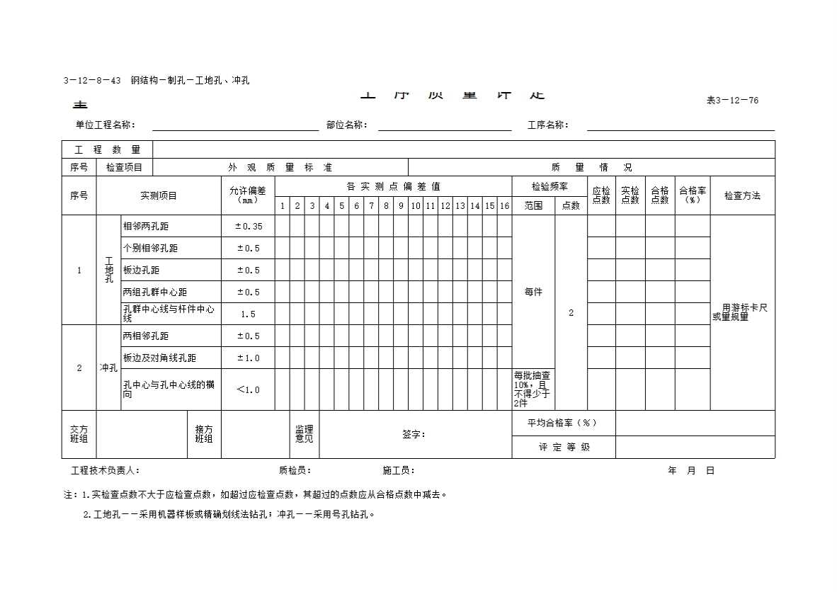 表格名称:工序质量评定表(钢结构—制孔—工地孔、冲孔)