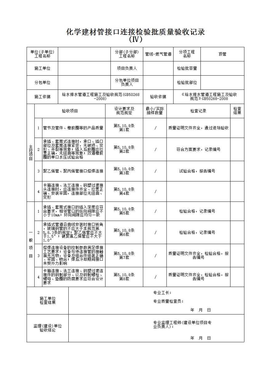 表格名称:化学建材管接口连接检验批质量验收记录(Ⅳ)