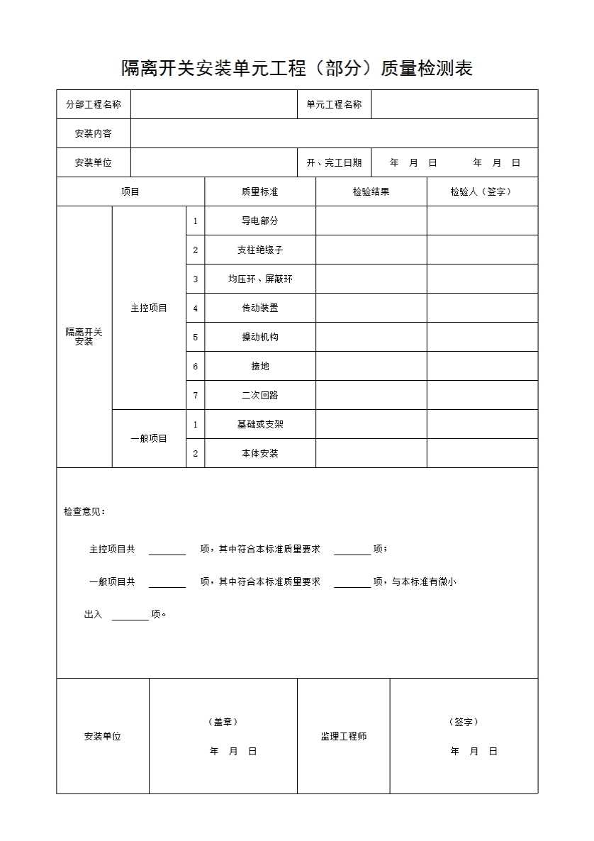 隔离开关单元工程安装质量验收评定表