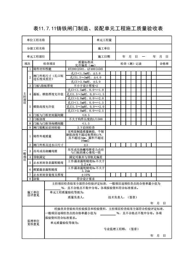 表格名称:表11.7.11 铸铁闸门制造、装配单元工程施工质量验收表