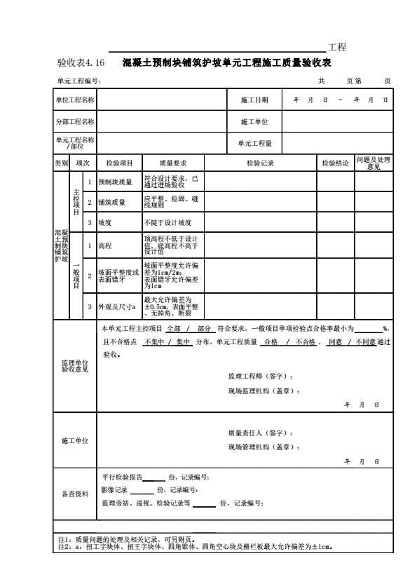 表格名称:表4.16 混凝土预制块铺筑护坡单元工程施工质量验收表