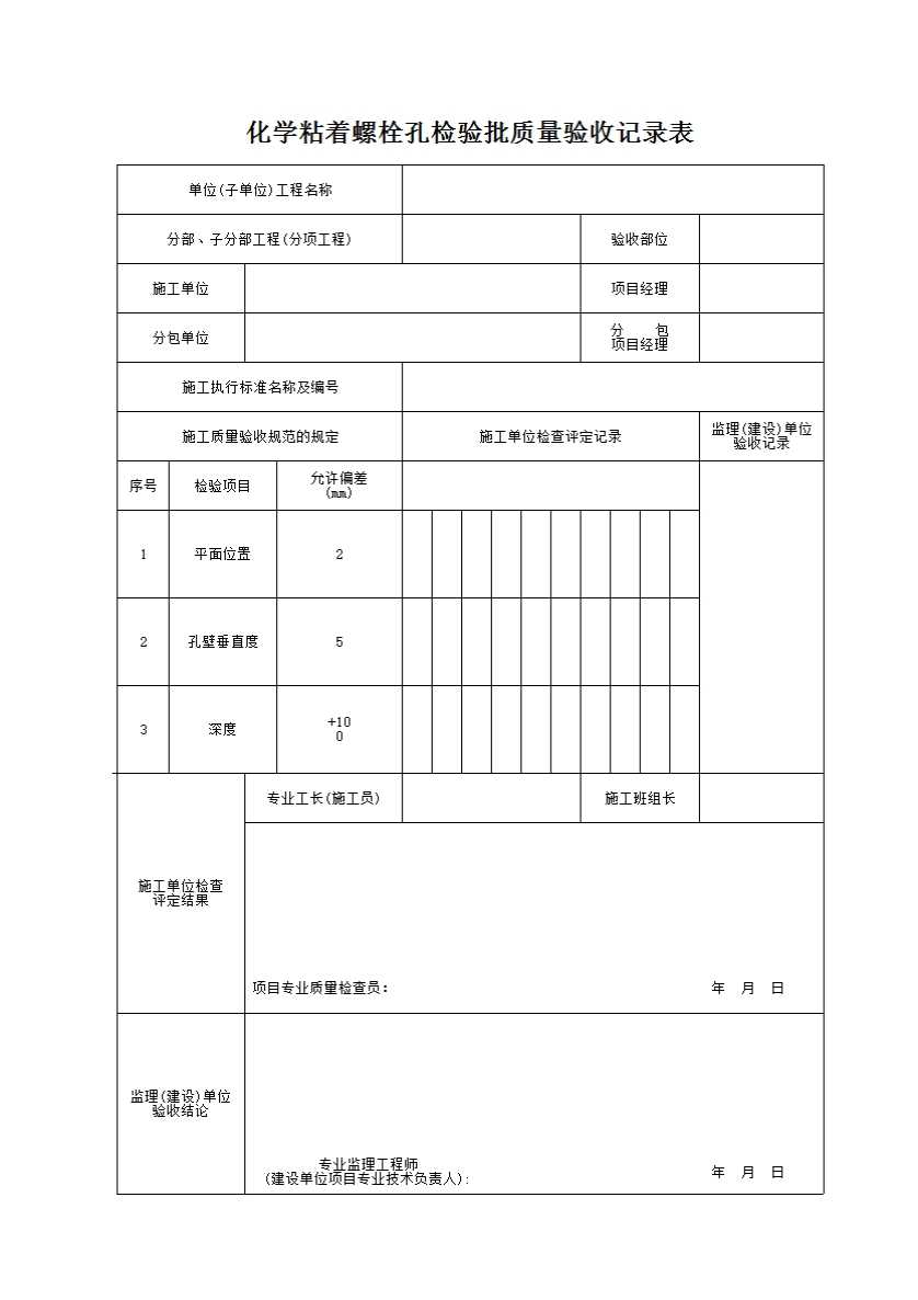 表格名称:化学粘着螺栓孔检验批质量验收记录表