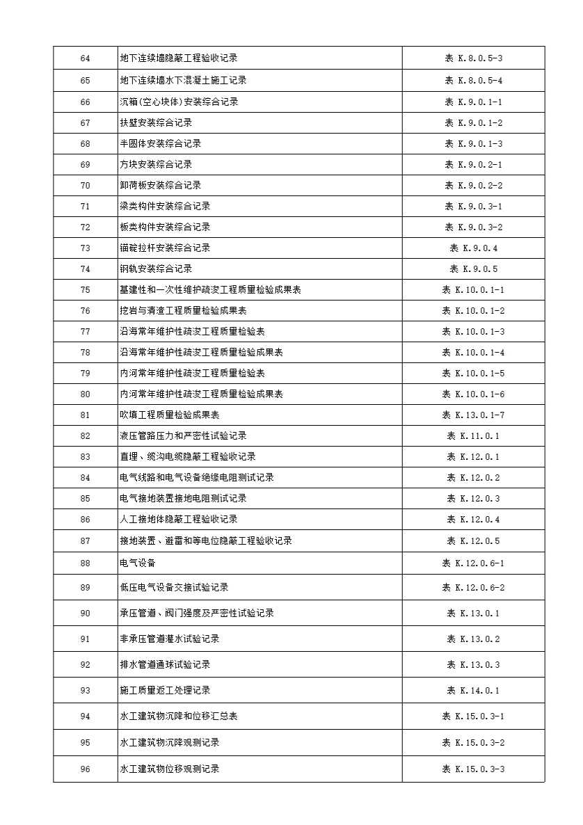 表K.16.0.1 水运工程质量控制资料统一用表目录