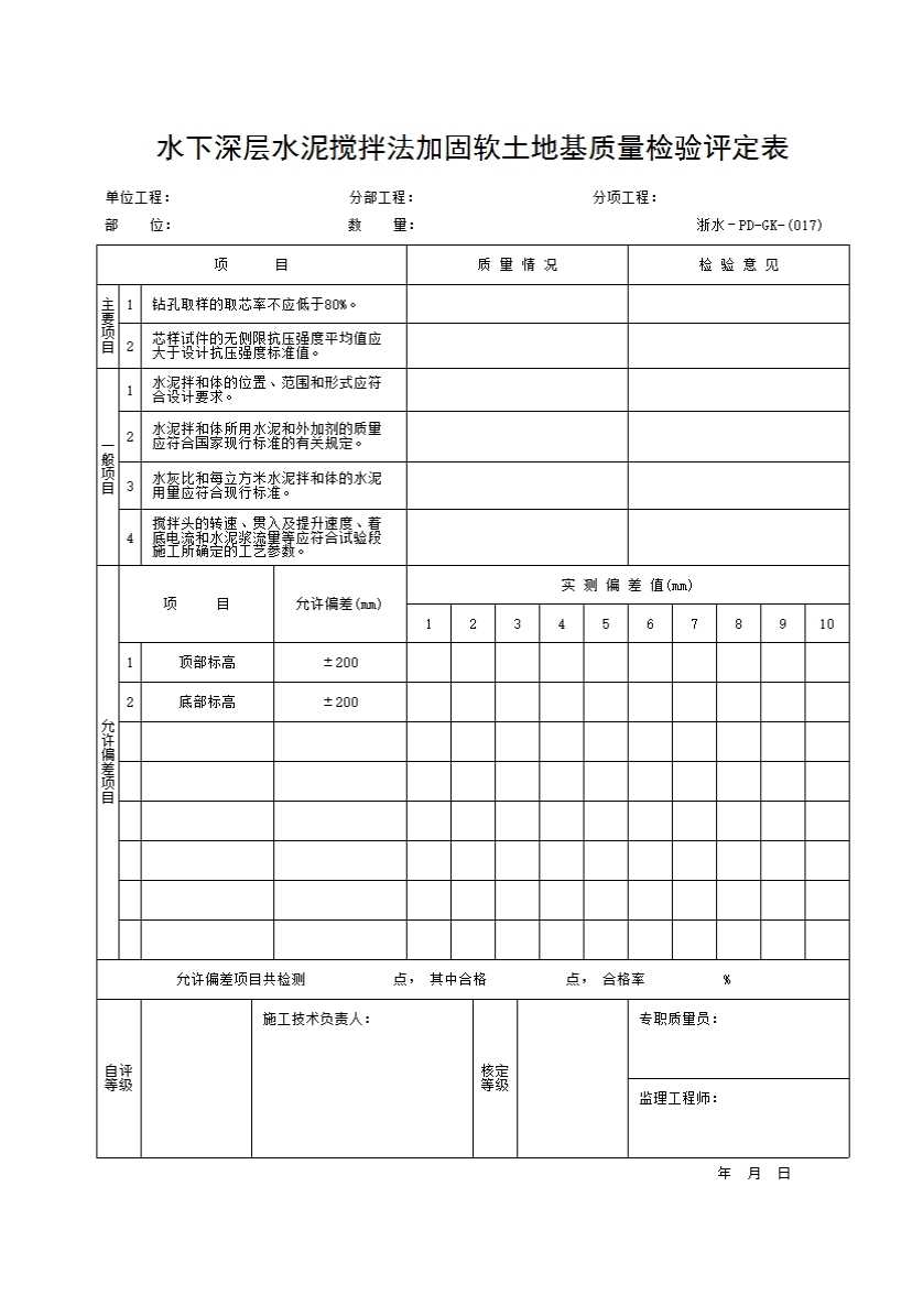 表格名称:017 水下深层水泥搅拌法加固软土地基质量检验评定表