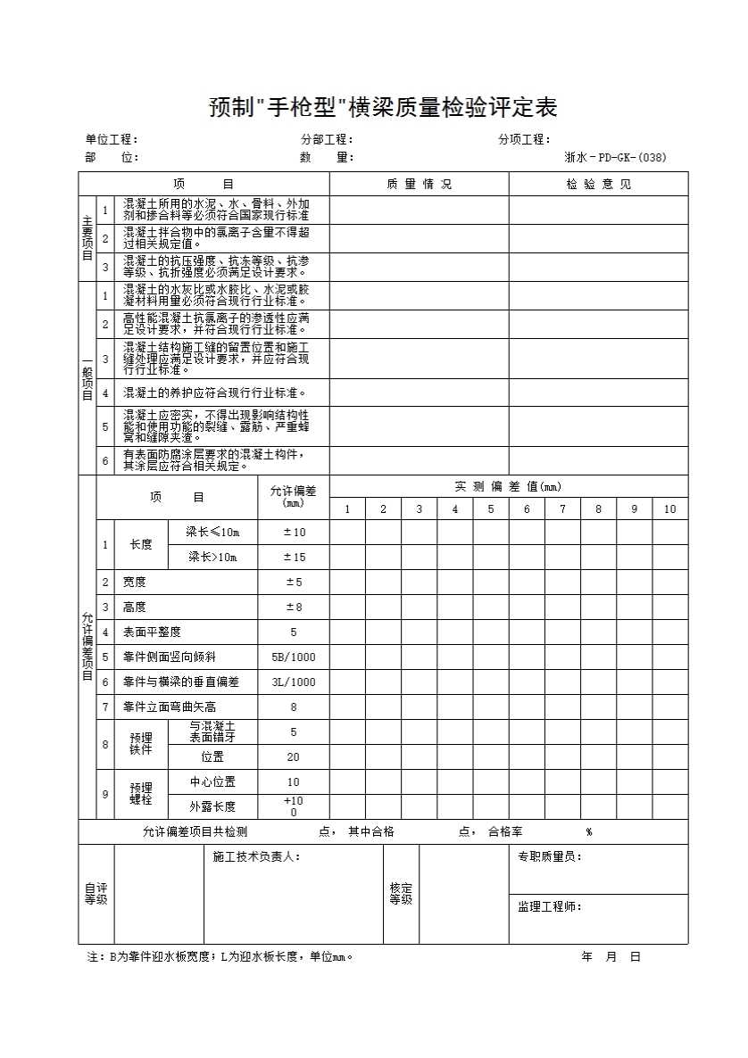 表格名称:038 预制“手枪型”横梁质量检验评定表