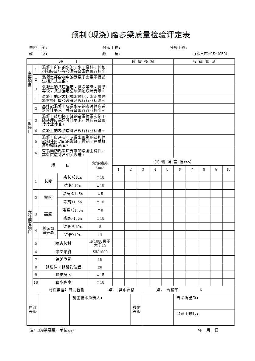表格名称:050 预制(现浇)踏步梁质量检验评定表