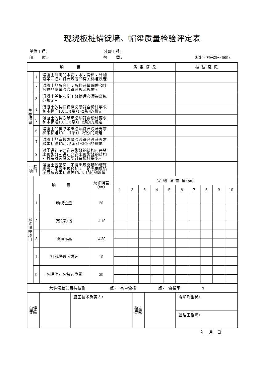 表格名称:060 现浇板桩锚锭墙、帽梁质量检验评定表