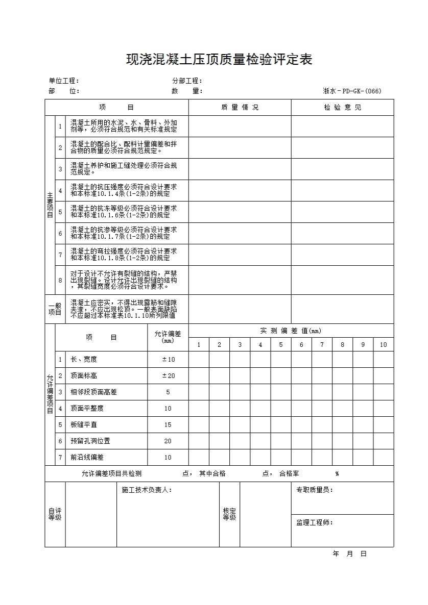表格名称:066 现浇混凝土压顶质量检验评定表