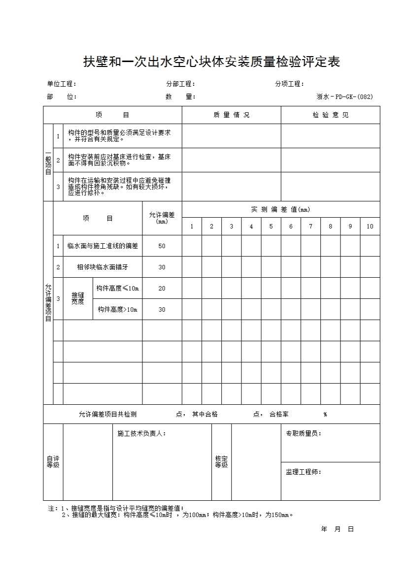表格名称:082 扶壁和一次出水空心块体安装质量检验评定表