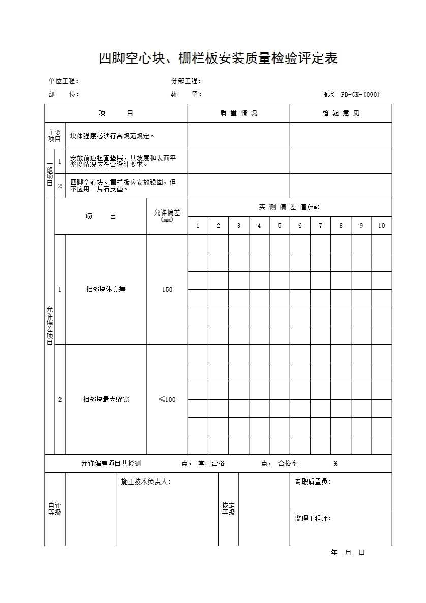 表格名称:090 四脚空心块、栅栏板安装质量检验评定表
