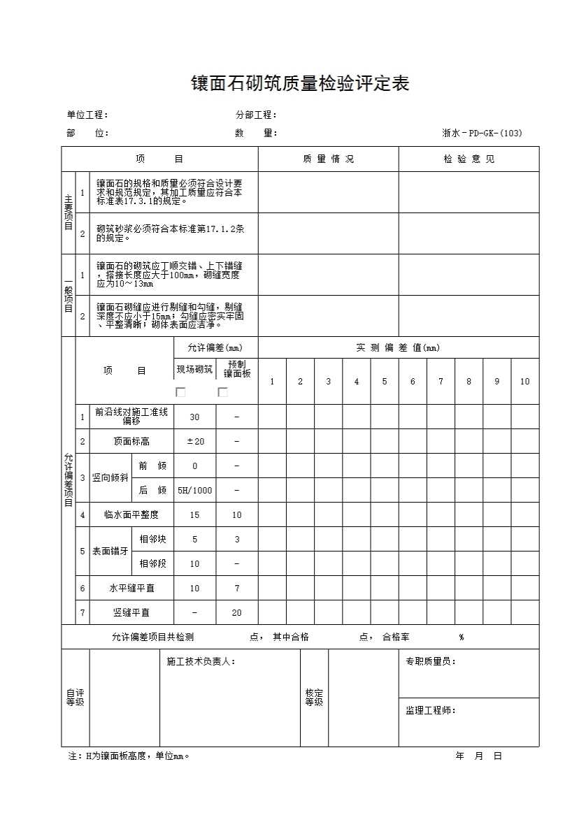 表格名称:103 镶面石砌筑质量检验评定表