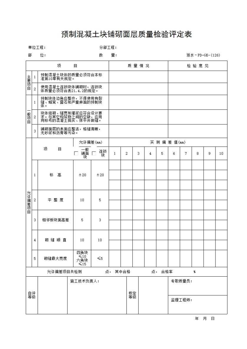 表格名称:126 预制混凝土块铺砌面层质量检验评定表