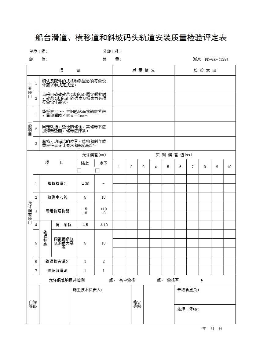 表格名称:129 船台滑道、横移道和斜坡码头轨道安装质量检验评定表