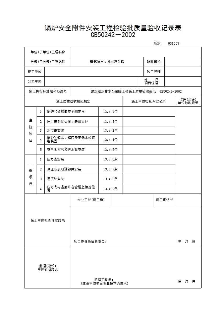 表格名称:182 锅炉安全附件安装工程检验批质量验收记录表