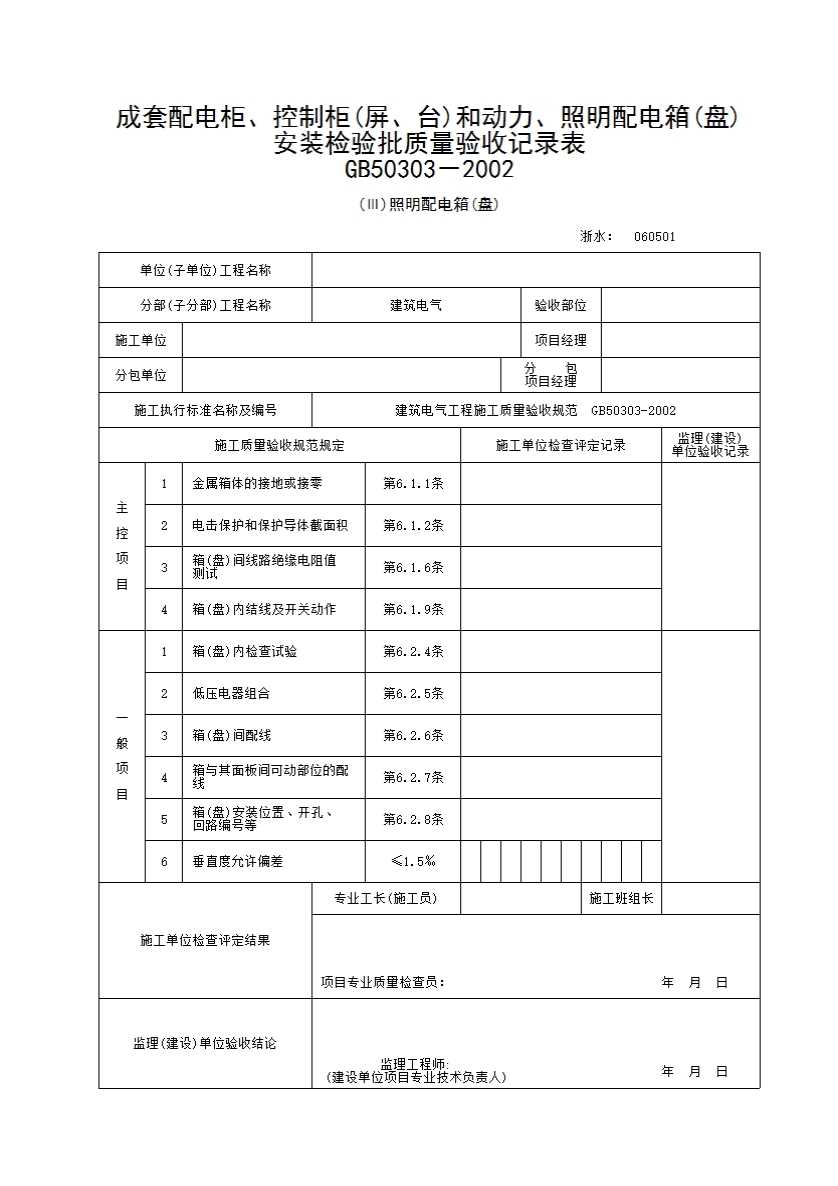 表格名称:188 成套配电柜、控制柜(屏、台)和动力、照明配电箱(盘)安装检验批质量验收记录表(III)照明配电箱(盘)