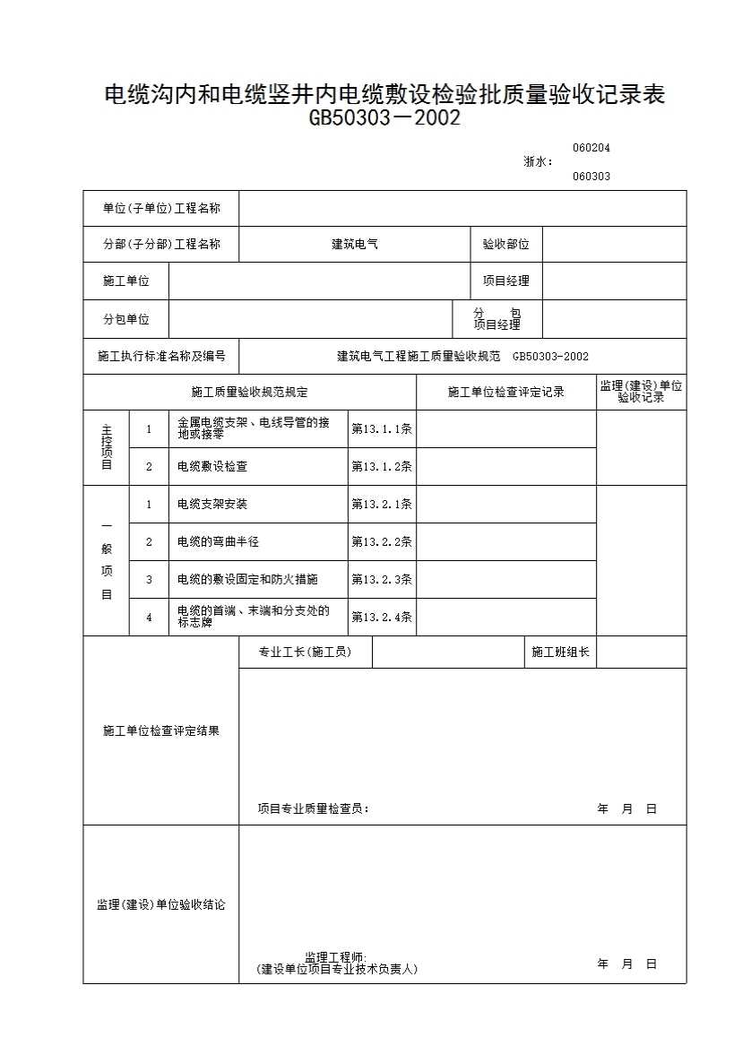 表格名称:195 电缆沟内和电缆竖井内电缆敷设检验批质量验收记录表