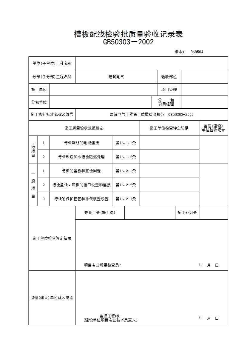 表格名称:199 槽板配线检验批质量验收记录表
