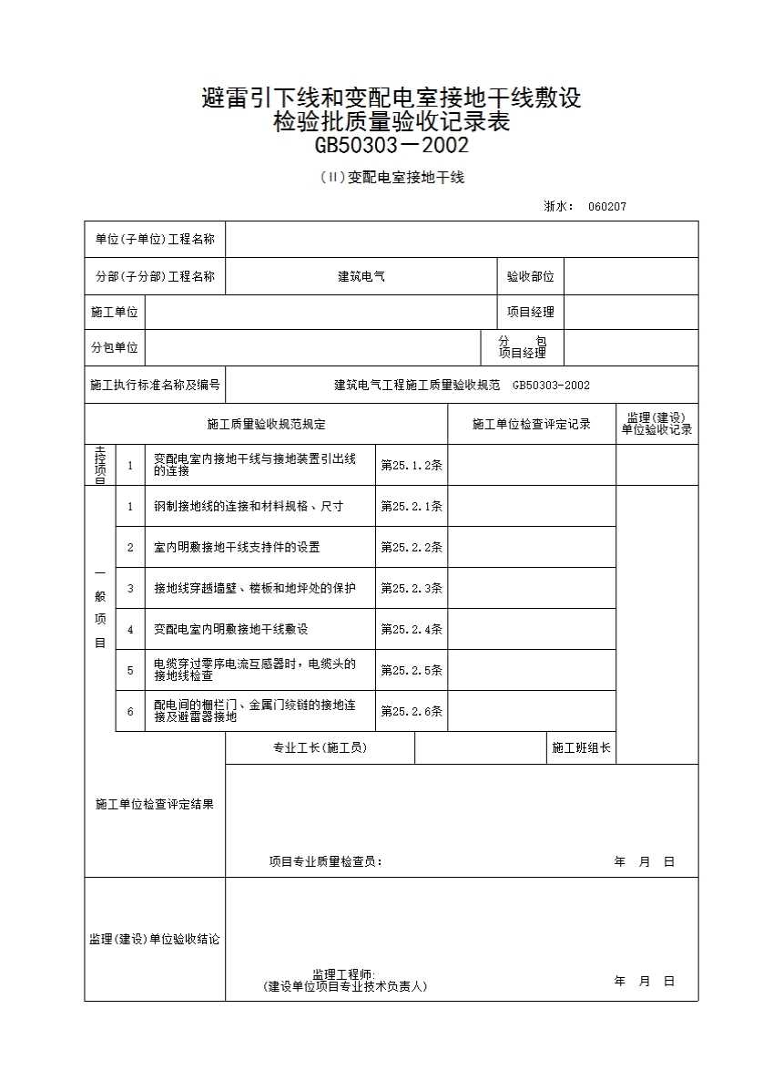表格名称:209 避雷引下线和变配电室接地干线敷设检验批质量验收记录表(II)变配电室接地干线