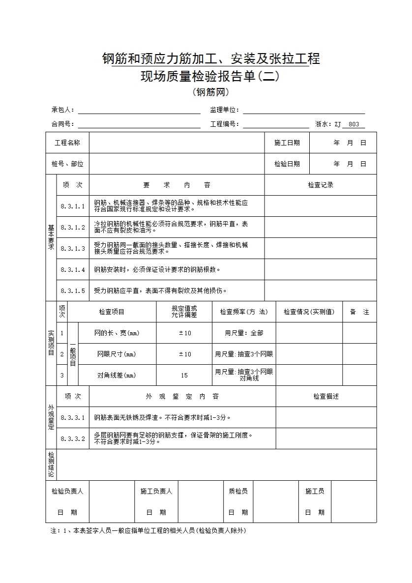 表格名称:浙水:ZJ803 钢筋和预应力筋加工、安装及张拉工程现场质量检验报告单(二)