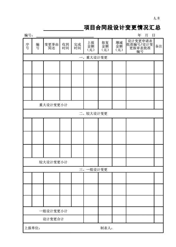表格名称:A.8 ________项目合同段设计变更情况汇总