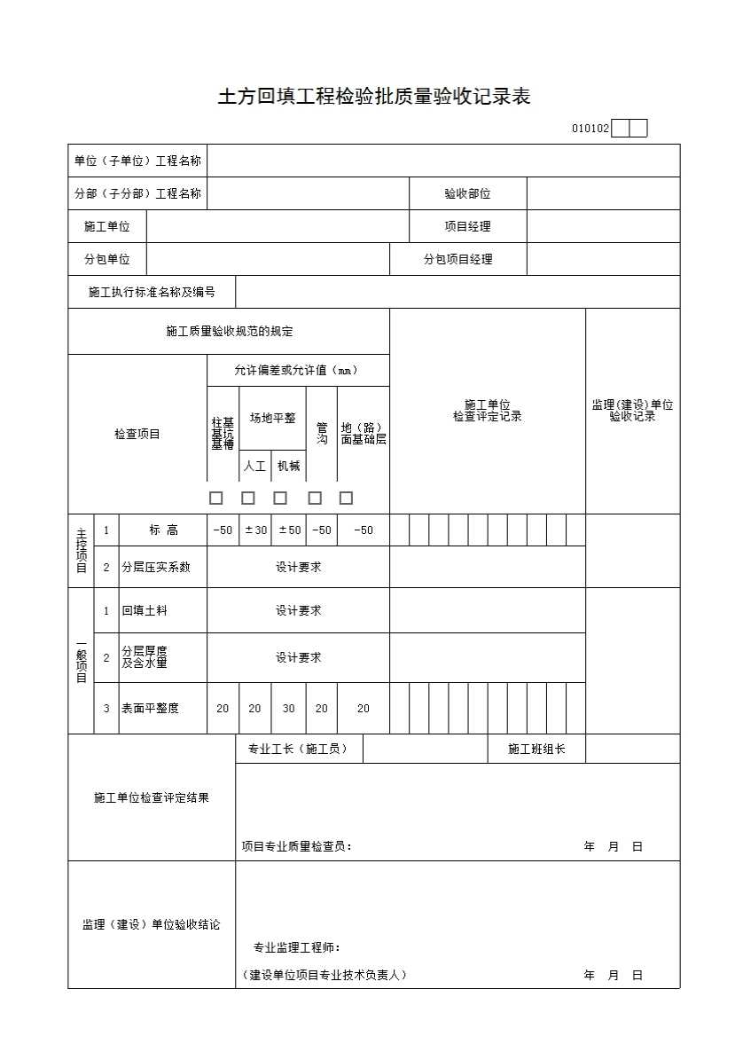 表格名称:010102 土方回填工程检验批质量验收记录表