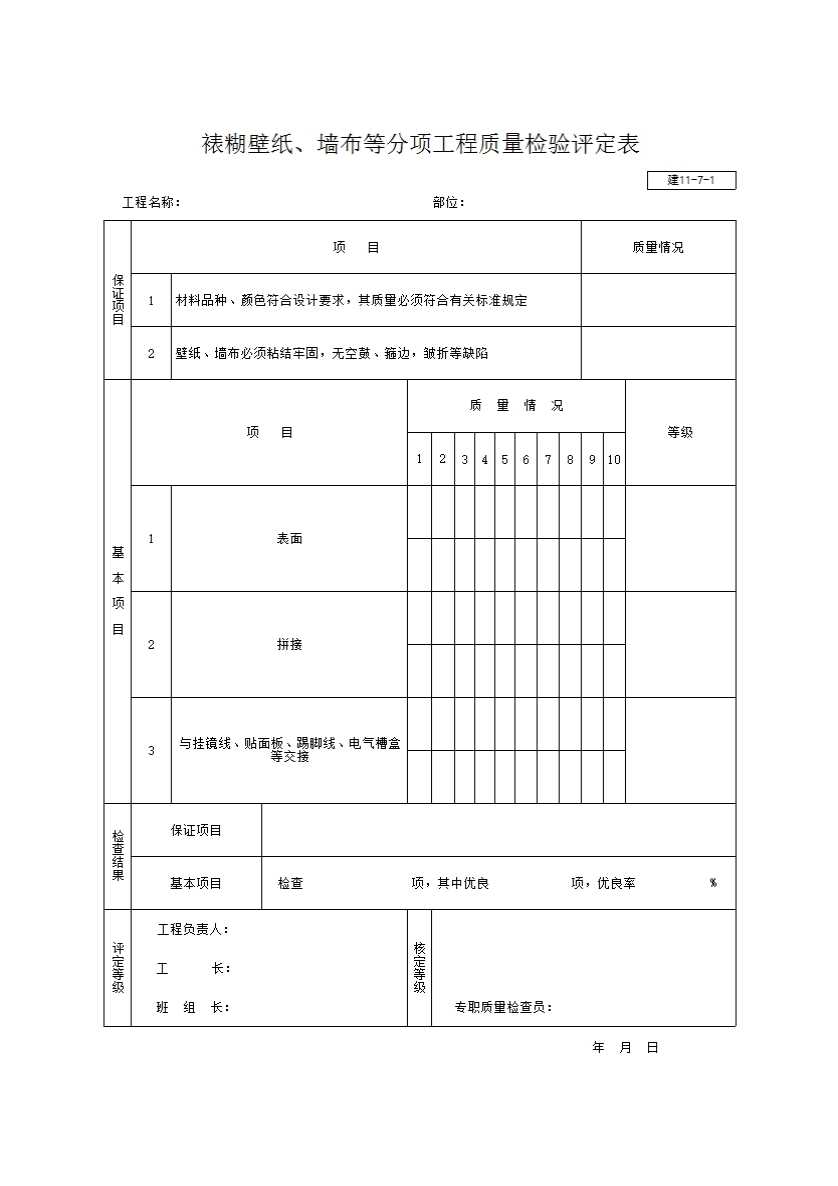 表格名称:裱糊壁纸、墙布等分项工程质量检验评定表