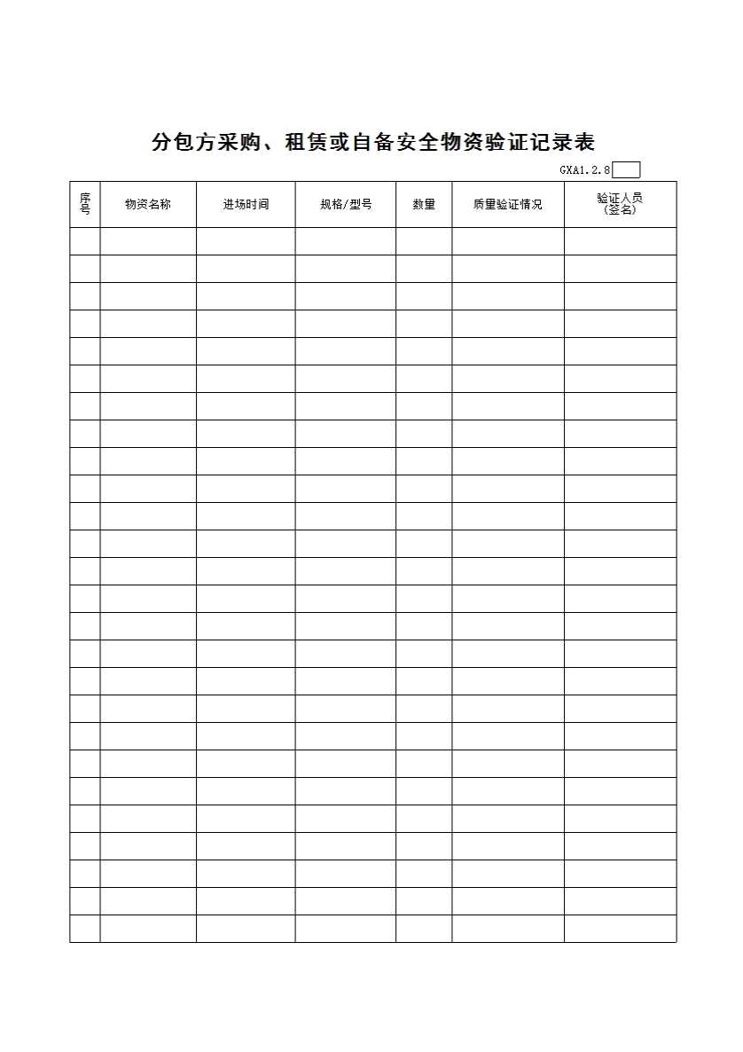 表格名称:分包方采购、租赁或自备安全物资验证记录表