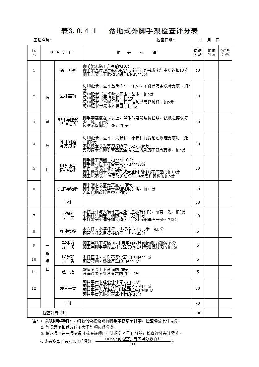 表格名称:表3.0.4-1落地式外脚手架检查评分表