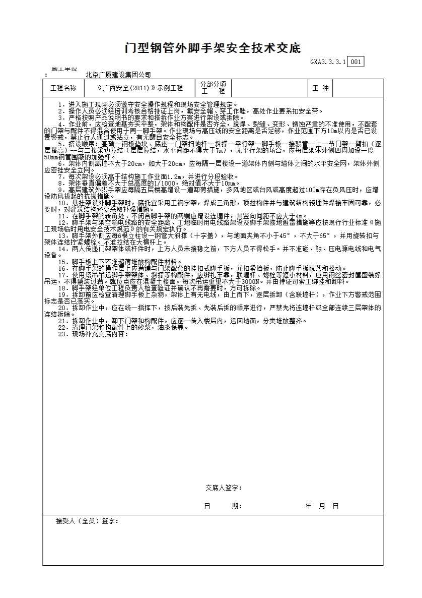 表格名称:门型钢管外脚手架安全技术交底