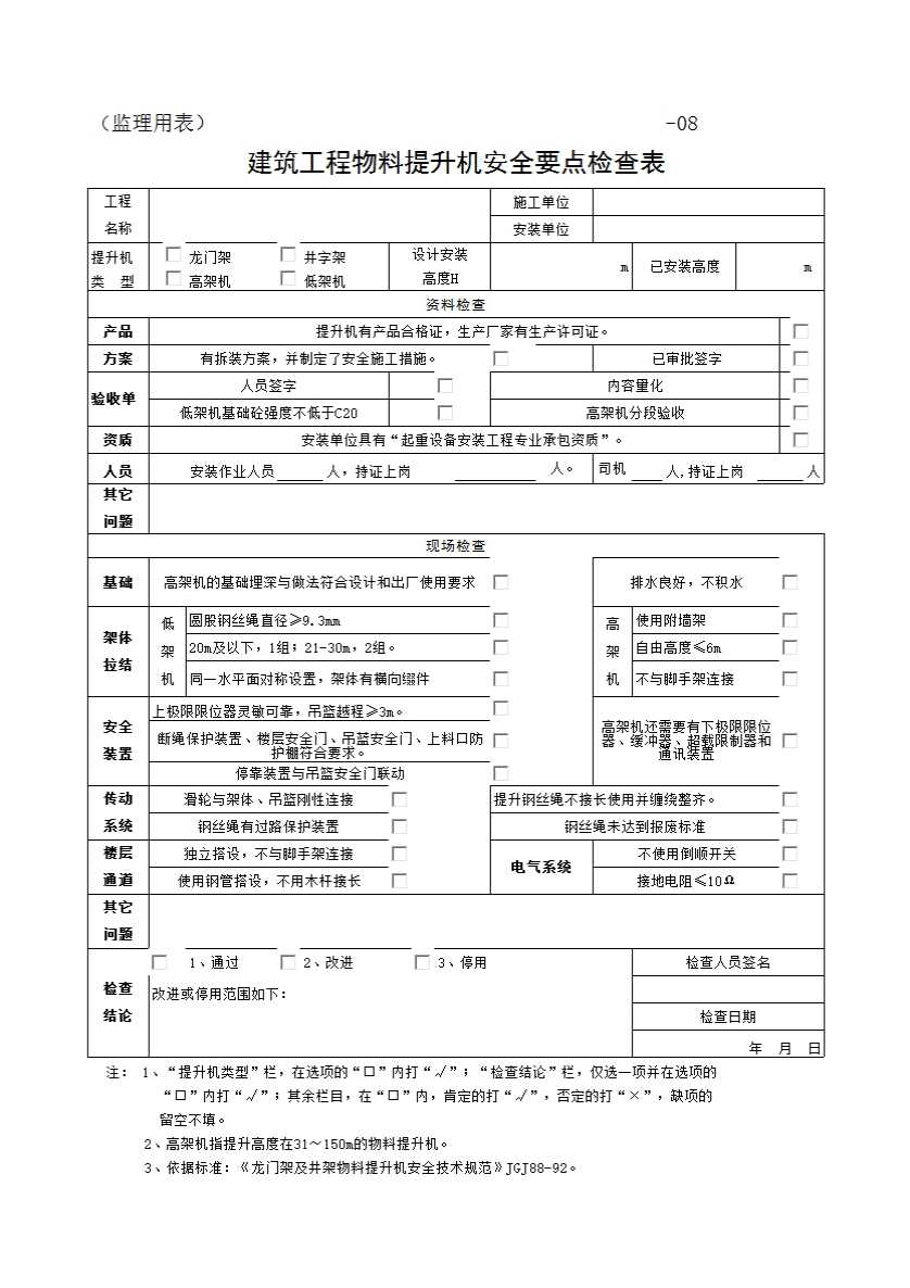 表格名称:建筑工程物料提升机安全要点检查表 AL-08