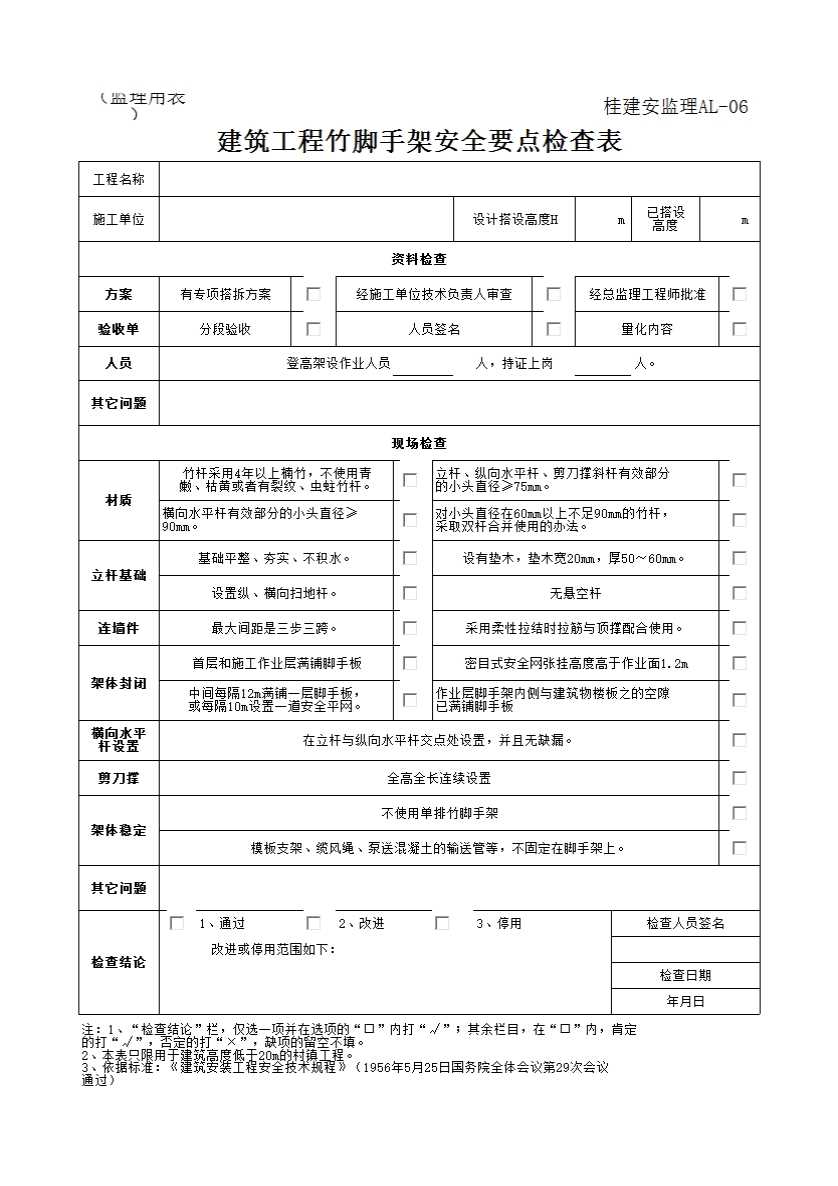 表格名称:建筑工程竹脚手架安全要点检查表 AL-06