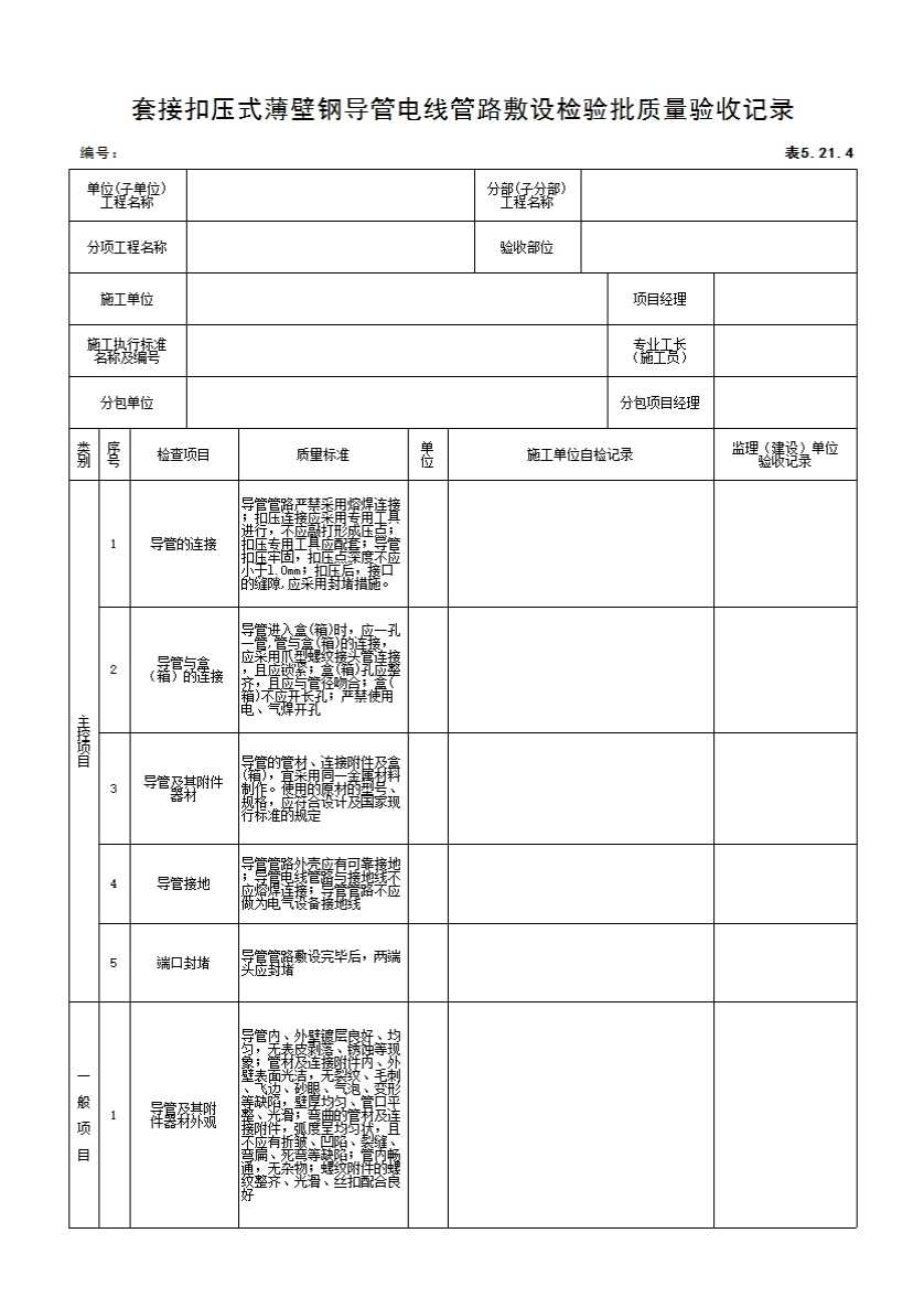 表格名称:5.21.4 套接扣压式薄壁钢导管电线管路敷设检验批质量验收记录