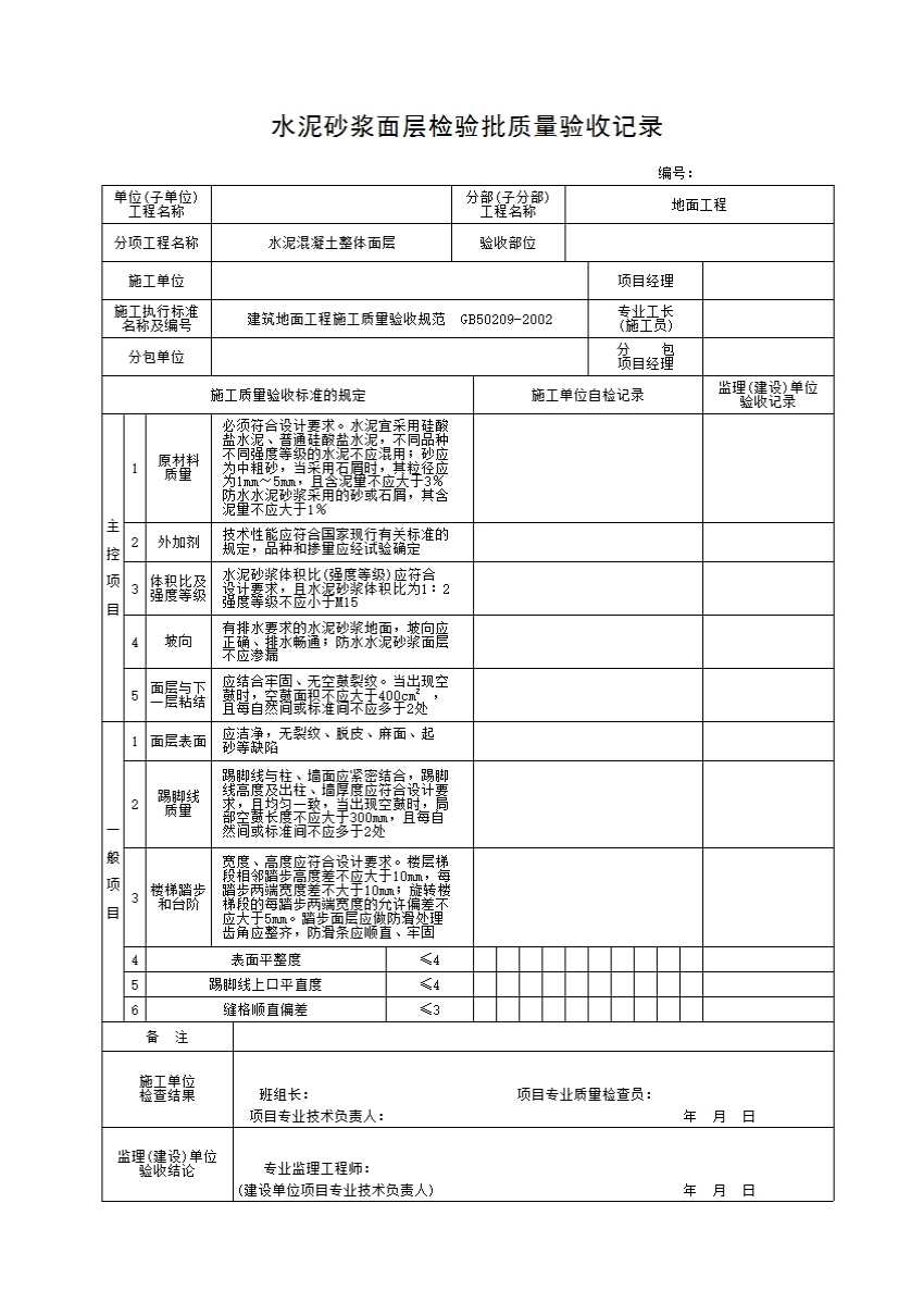 3) 水泥砂浆强度试块的组数: 按每一层(或检验批) 建筑地面工程不应小于 1 组。 当改变配合比时, 亦应相应地制作试块组数。