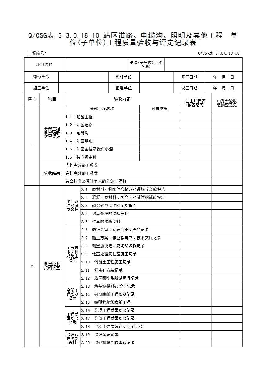 QCSG 表 3-3.0.18-10 站区道路、电缆沟、照明及其他工程 单位(子单位)工程质量验收与评定记录表