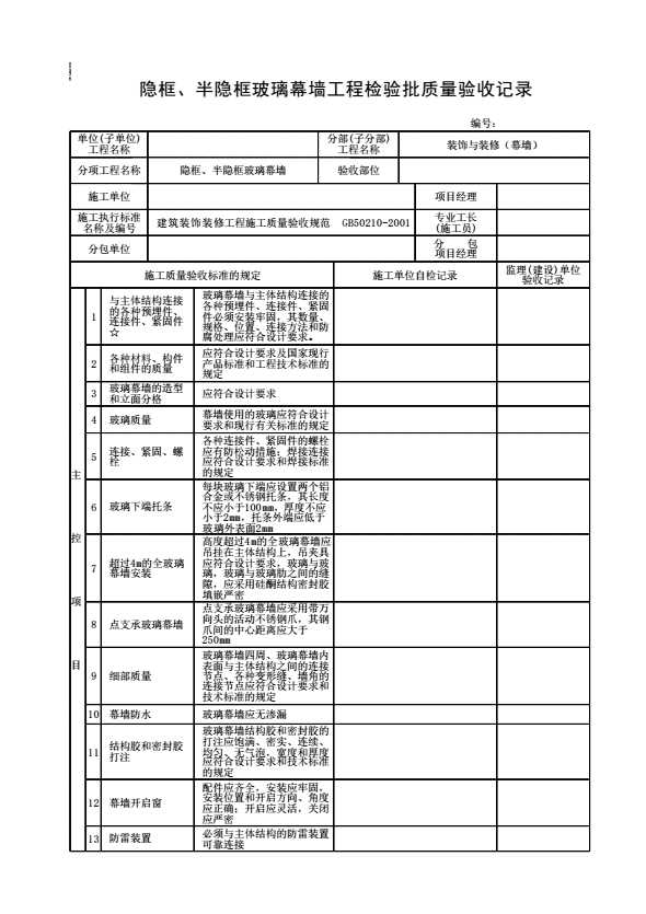 表格名称:隐框、半隐框玻璃幕墙工程检验批质量验收记录