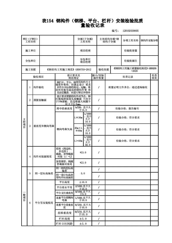 表格名称:120102030605 钢构件(钢梯、平台、栏杆)安装检验批质量验收记录