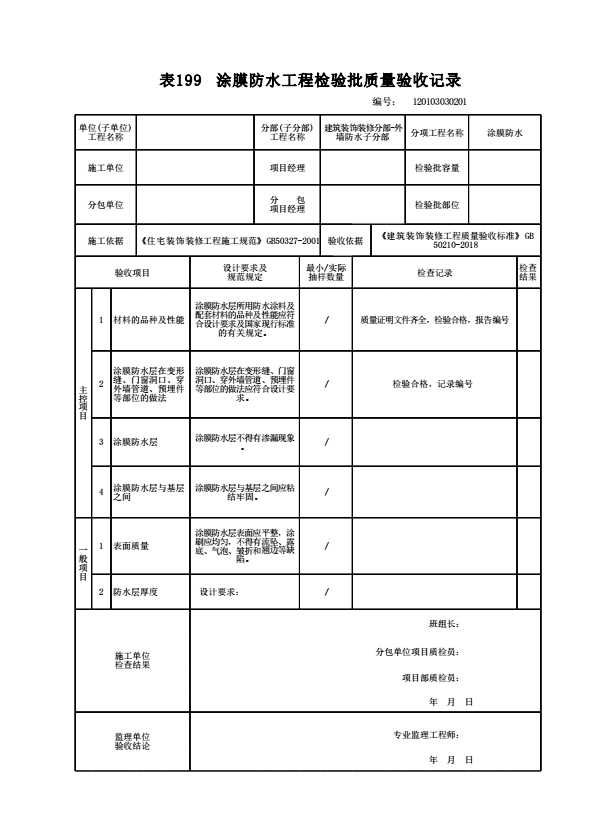 表格名称:120103030201 涂膜防水工程检验批质量验收记录