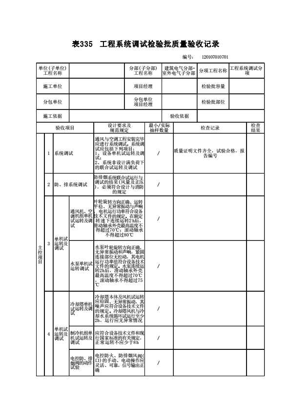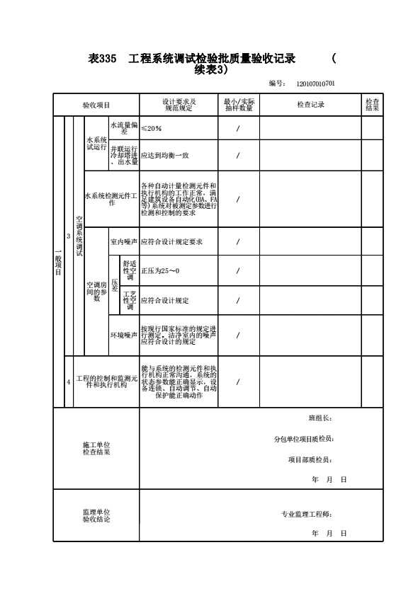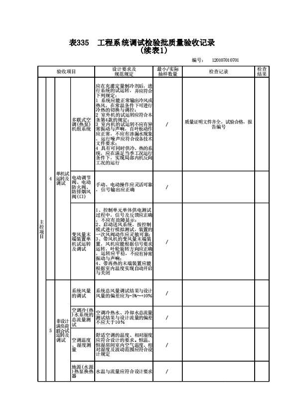表格名称:120107010701 工程系统调试检验批质量验收记录