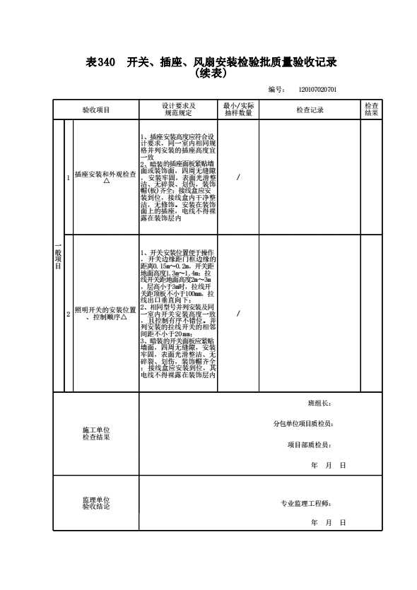 表格名称:120107020701 开关、插座、风扇安装检验批质量验收记录