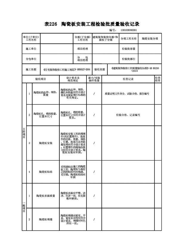 表格名称:130103080301 陶瓷板安装工程检验批质量验收记录